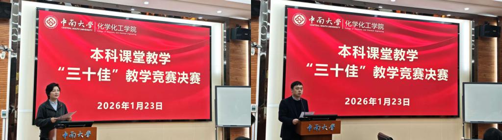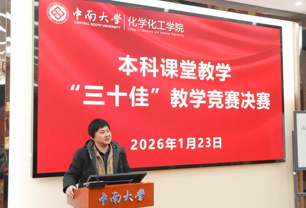 为进一步加强教师队伍建设,调动教师教学积极性与创造性,择优选拔优秀参赛教师,筹备2026年度学校工会与本科生院的“三十佳”教学竞赛活动,2026年1月23日上午,中南大学化学化工学院在化学楼129报告厅成功举办2026年本科课堂教学“三十佳”竞赛。学院党委书记刘有才,副院长何震,学校本科教学督导委员会罗一鸣、秦毅红、夏伟怀、刘卫国、杨宇等多位领导专家到场指导。学院党委副书记、工会主席滕晓雯主持本次活动。