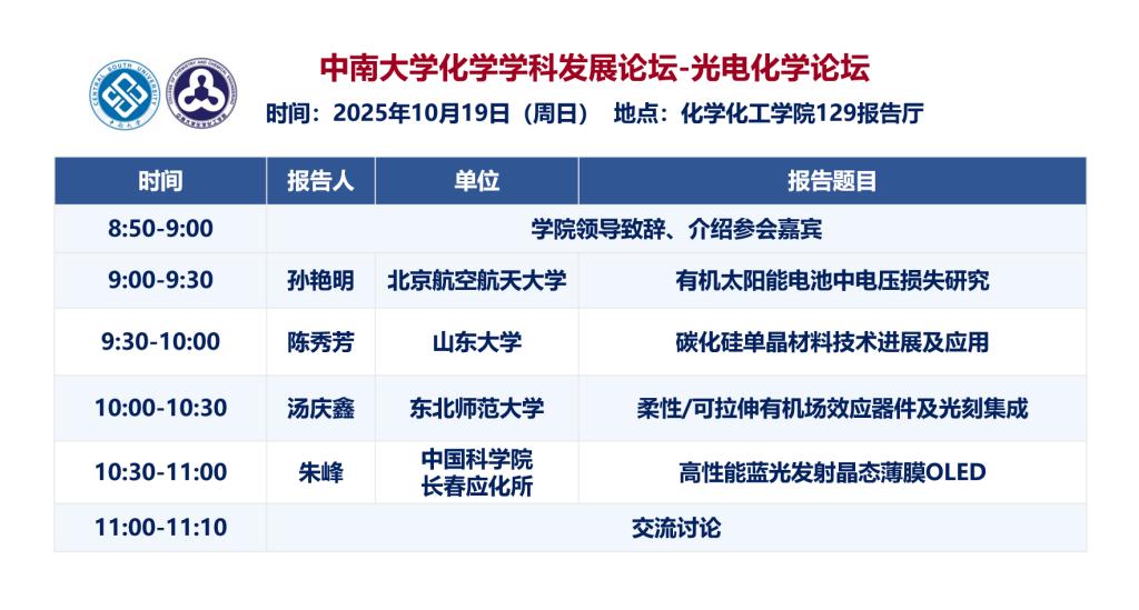 报告题目:中南大学化学学科发展论坛-光电化学论坛 报 告 人: 时 间: 2025年10月19日 地 点: 化学化工学院129报告厅