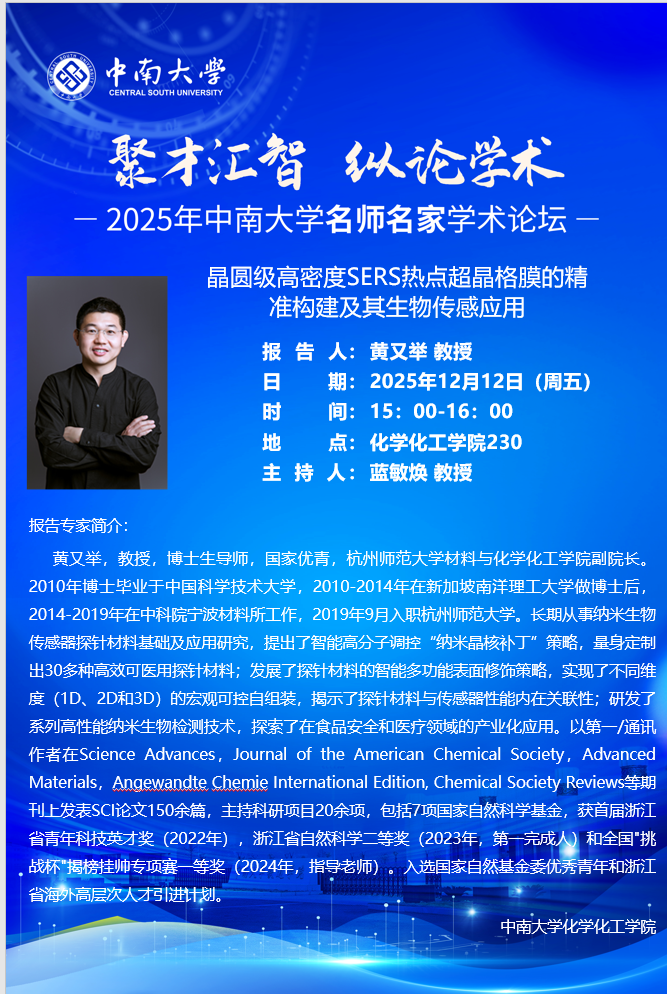 报告题目:晶圆级高密度SERS热点超晶格膜的精准构建及其生物传感应用 报 告 人:黄又举 教授 杭州师范大学 时 间: 2025年12月12日(周五) 15:00-16:00 地 点: 化学化工学院230