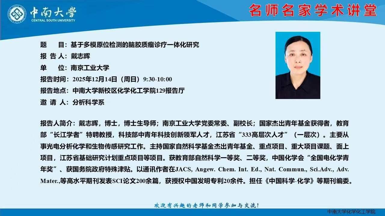 报告题目:基于多模原位检测的脑胶质瘤诊疗一体化研究 报 告 人:戴志晖 南京工业大学 时 间: 2025年12月14日(周日)9:30-10:00 地 点: 中南大学新校区化学化工学院129报告厅