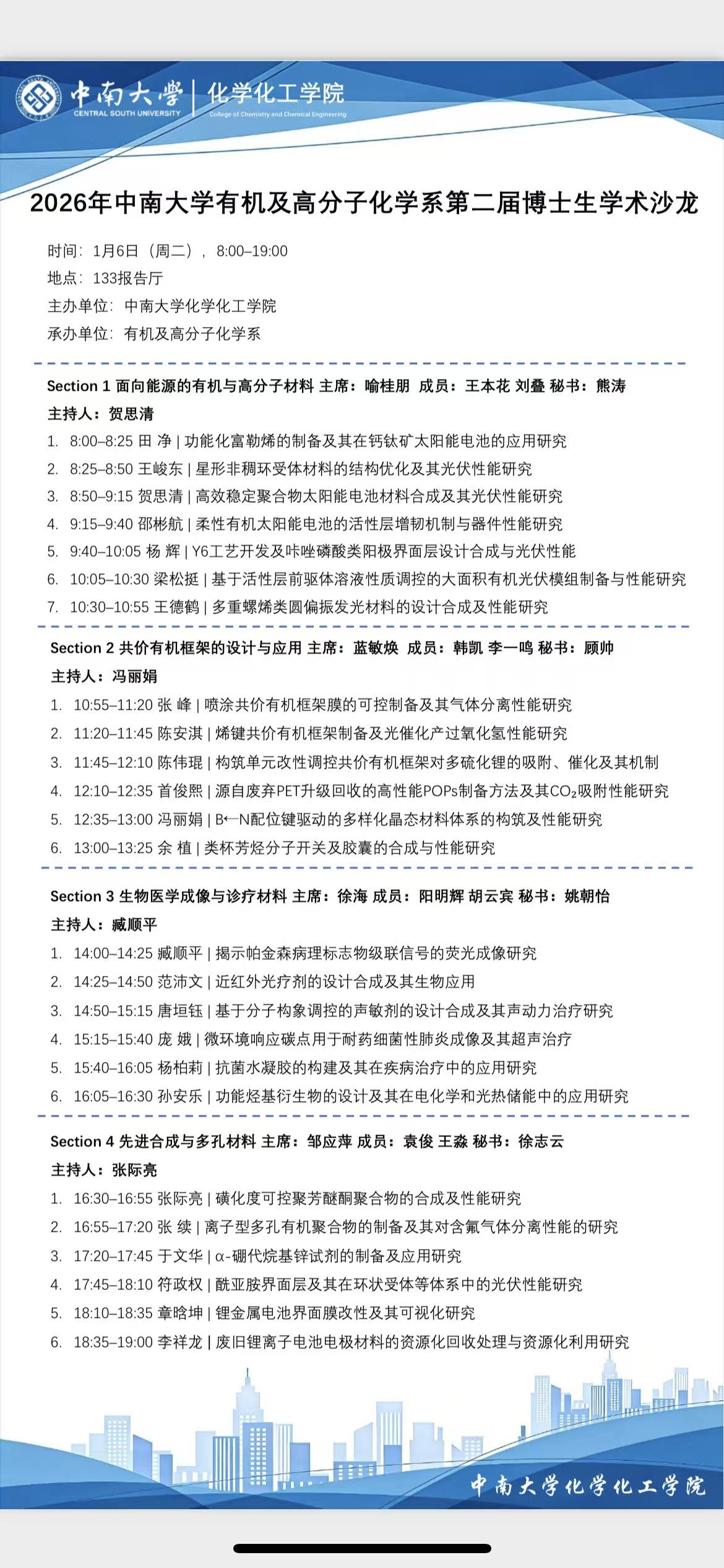 报告题目:2026年中南大学有机及高分子化学系第二届博士生学术沙龙 报 告 人:中南大学化学化工学院有机及高分子化学系 时 间: 1月6日(周二),8:00-19:00 地 点: 133报告厅