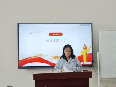 会议第三项,支部书记聂佳同志代表支委会作2025年度化学化工学院硕士生制药工程党支部年度述职报告。她全面总结过去一年支部在思想政治理论学习、组织生活建设开展、党员教育管理等方面的工作开展情况,也客观分析了工作中存在的不足,并明确下一步整改方向与工作举措。述职完毕后,全体党员对支部书记的履职情况进行民主测评。