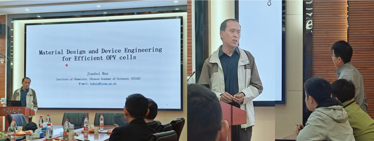 中国科学院化学研究所的侯剑辉研究员,以《有机光伏材料与器件近期进展》为题展开报告。他聚焦有机光伏(OPV)技术效率、成本、稳定性三大核心议题,详解通过官能团设计降低能量损失的研究成果,展示了多种OPV材料的静电势(ESP)差异,阐述通过调控给体-受体(D-A)相互作用减少能量损失的机制。此外,还介绍了OPV电池的成膜工艺优化新策略,实现了成膜过程的精准调控,对提升二元OPV电池性能具有重要意义。侯剑辉研究员团队在非富勒烯受体有机光伏电池领域持续保持国际领先水平,其研究为有机光伏材料设计与器件工程提供了前沿视角,助力中南大学师生深入探索高效OPV技术。