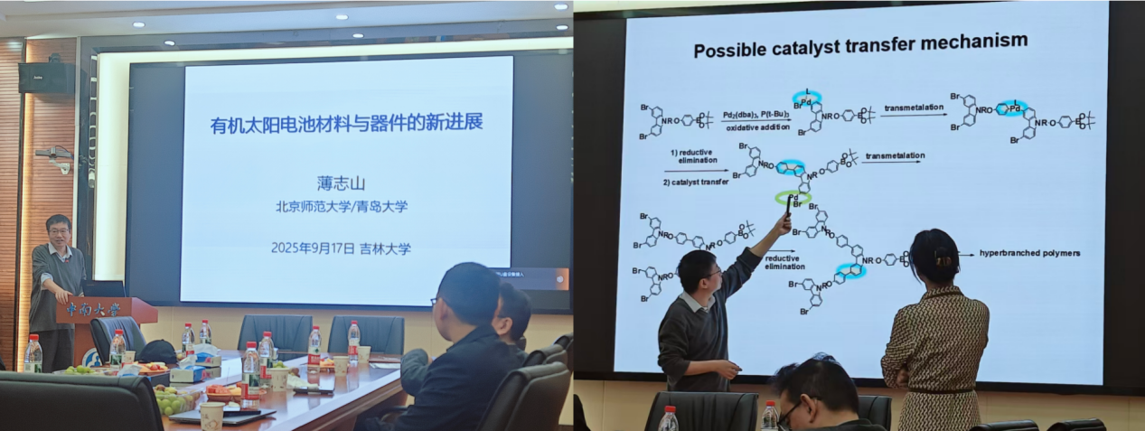随后,北京师范大学薄志山教授以《有机太阳电池材料与器件的新进展》为题作报告。他从有机太阳能电池的核心原理、发展历程及最新研究进展切入,结合自身研究经验,阐释了有机光伏材料的结构设计、性能优化及实际应用前景,为在场师生带来了兼具理论深度与实践价值的学术分享。薄教授结合课题组近期在有机光伏材料与器件领域研究成果,系统呈现了非稠环受体分子材料与多级次超分子组装技术从设计到应用的完整研究链条。通过对基团改变、偶极分子结构设计策略,提供了新的界面分子设计思路,并成功研发出一系列具备高光电转化效率的光伏材料,为有机太阳能电池的性能突破提供了新的技术路径。