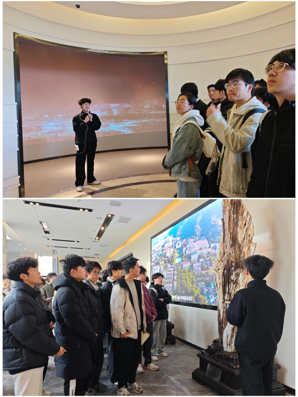活动伊始,同学们在博物馆门前集合,地质专业学长作为特邀讲解员,梳理了活动流程与核心看点,介绍了博物馆的建馆历史与馆藏特色——馆内千余件标本涵盖矿物、岩石、古生物化石等类别,堪称“地球历史的立体教科书”。进入馆内,在学长引导下,巨型水晶簇、古生物群化石、稀有矿石等镇馆之宝引得同学们驻足惊叹,学长结合地质成因、形成年代等知识,将标本背后的地球故事娓娓道来。