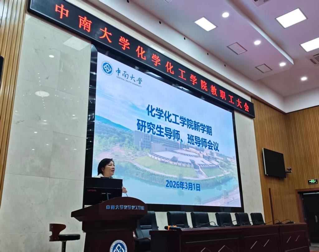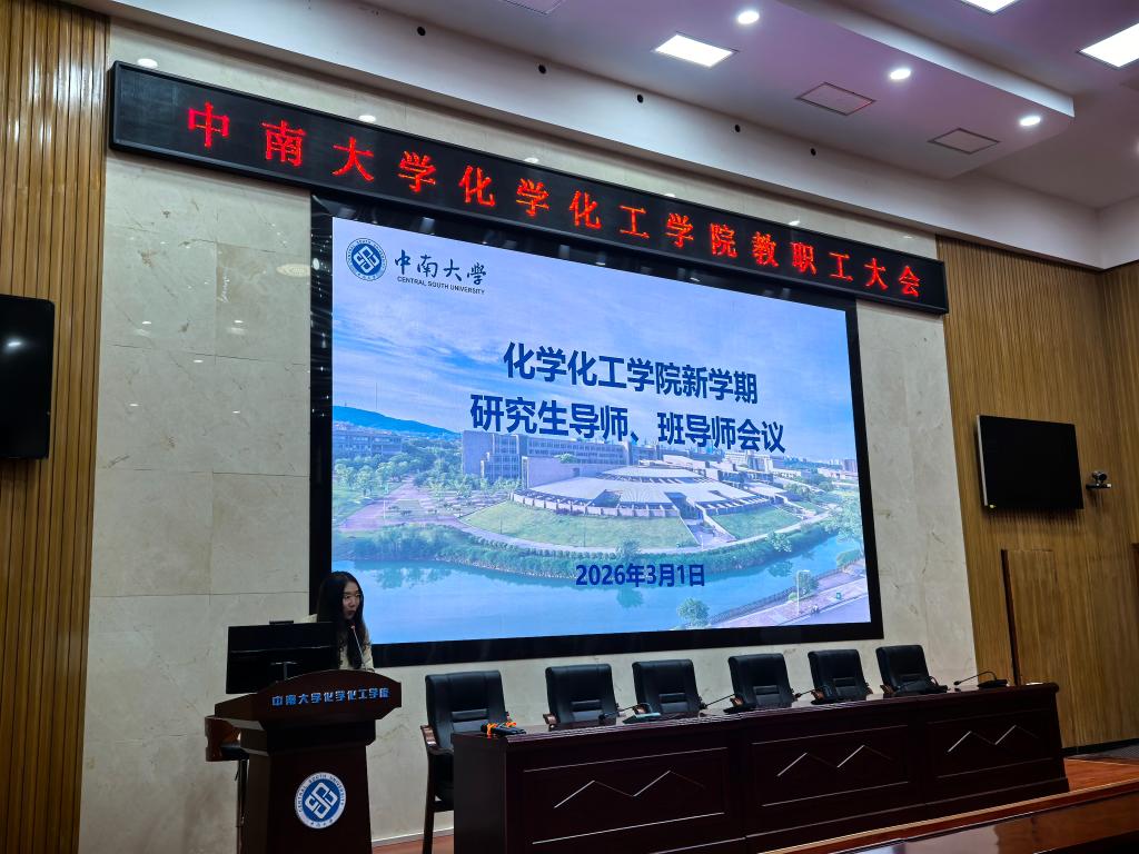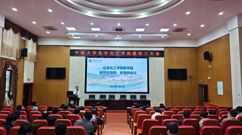 为进一步提高学院思想政治教育工作效能,落实“三全育人”的工作要求,加强导师队伍建设,促进学生成长成才,中南大学化学化工学院于3月1日下午在化工楼133报告厅召开2026年春季学期研究生导师、班导师会议,学院党委书记刘有才、党委副书记滕晓雯,全体研究生导师、班导师、辅导员出席会议,此次会议由辅导员赵元超主持。