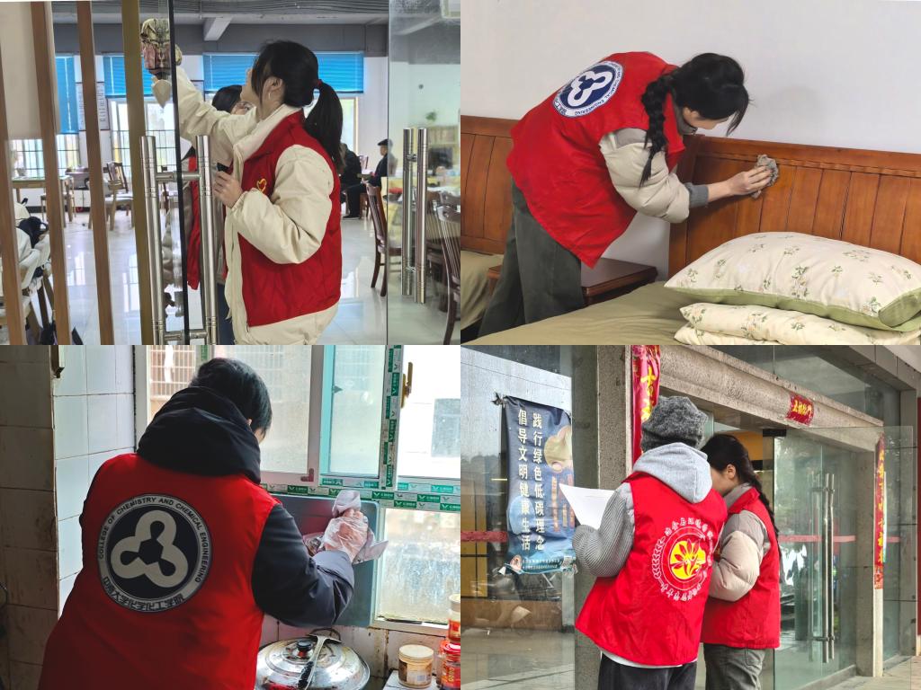 一抹“志愿红”,擦亮社区文明底色。下午16时,同学们准时抵达社区,迅速分为两组投入工作。第一组负责入户助老清扫,同学们在社区工作人员引导下,走进高龄、独居老人家中,擦窗扫地、归整物品。服务之余,同学们围坐在老人身边拉家常、问冷暖,用热情与耐心传递温暖。第二组承担社区服务站及公共区域清洁,同学们手持扫帚、抹布等工具,对服务站门窗、活动室、社区广场进行全面清理,使社区面貌焕然一新。