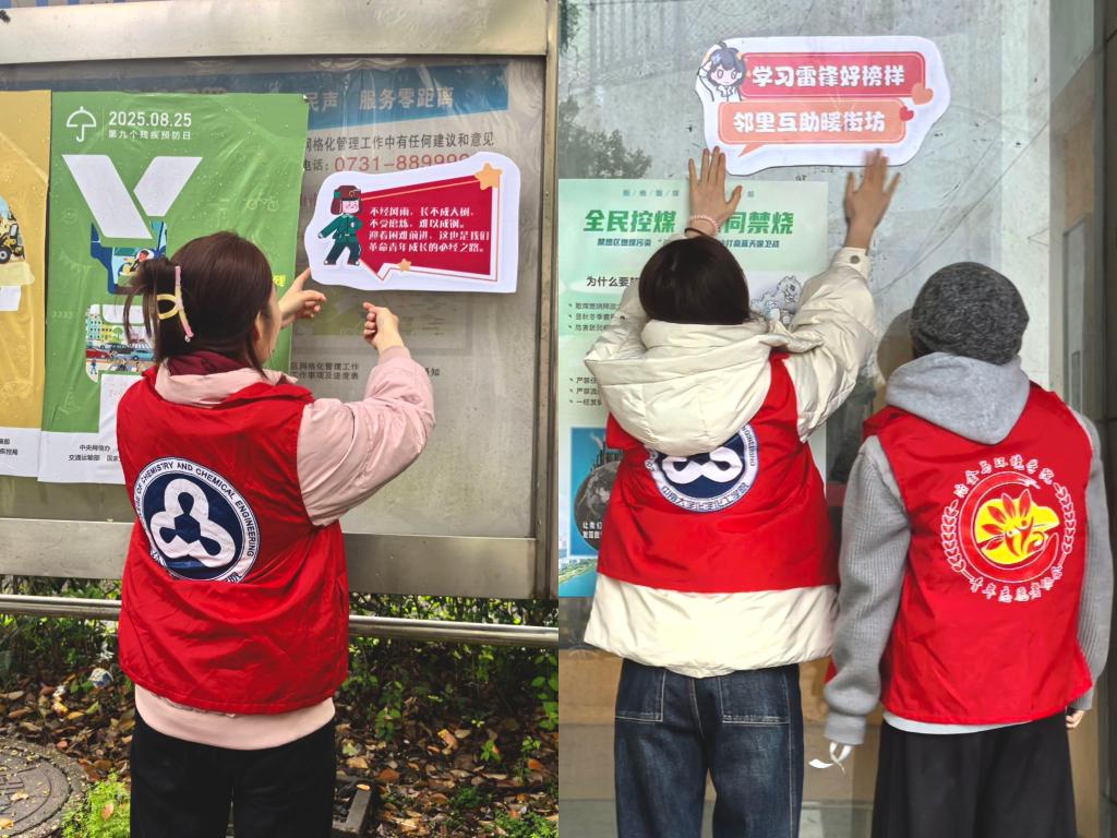 一张“文明贴”,传递时代新风正气。在开展清洁服务的同时,支部另设文明标语张贴组。同学们深入社区消防通道、单元门口、公告栏等重点区域,先细致清理墙面污渍与残留广告,再按照统一高度与标准,平整张贴“安全出行”“学习雷锋”等主题标语。一贴一抚之间,既美化了楼道环境,更将文明理念悄然植入居民心中。